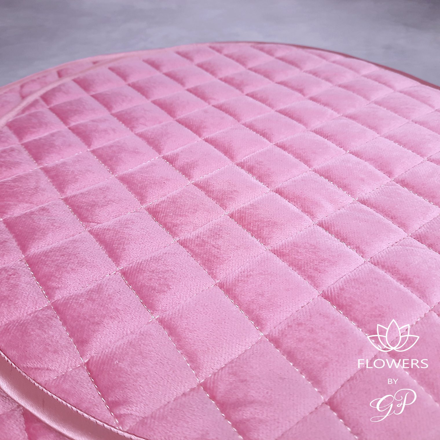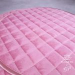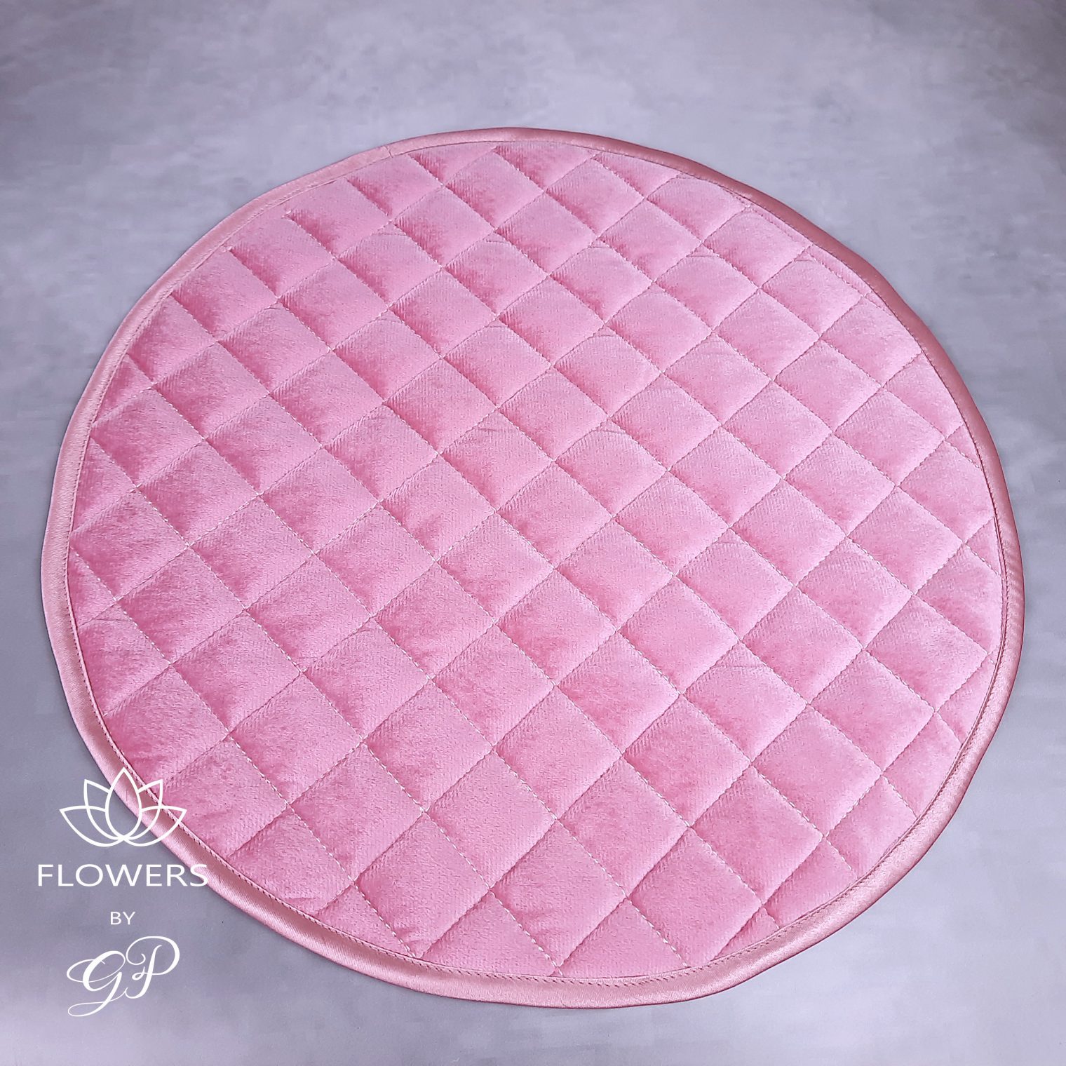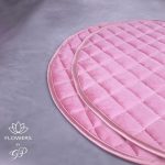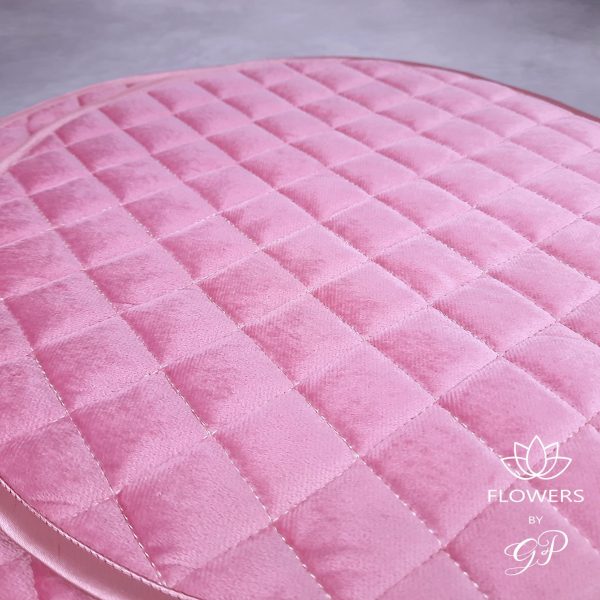 Rožinės spalvos aksominė servetėlė. Apvalios formos, išsiuvinėta rombo formos raštu. Servetėlės yra tinkamos papuošti komodoms, lentynoms ir valgomajam stalui. Puikiai dera su dekoratyvinėmis gėlių puokštėmis.